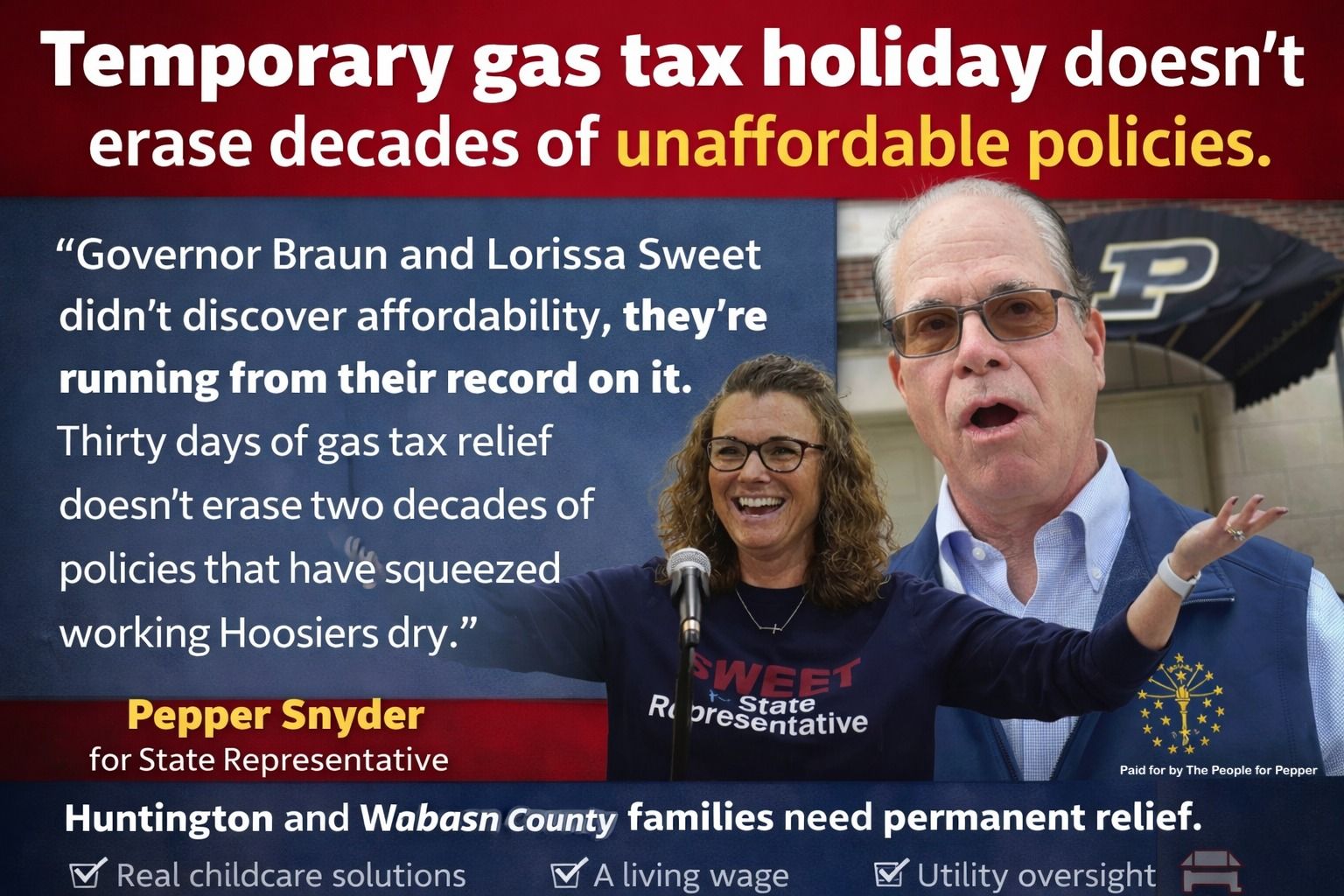Indiana Republicans have held a supermajority for twenty years. They own every decision that has made this state less affordable for working families. They gave billion-dollar corporations sweetheart tax deals while Hoosiers watch their utility bills climb to match their rent. Childcare, if you can even find it, is out of reach for families who need it most. A pound of hamburger now costs more per pound than Indiana's minimum wage. And the highest gas tax in the nation? That's twenty years of Republican priorities on full display.